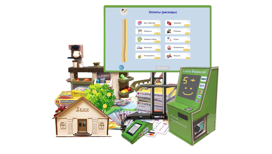 Различные модели комплексов «Азбука Финансов» имеют различное наполнение и предназначение. В зависимости от конкретного образовательного учреждения, возрастной группы детей и от формы занятий, которые будет проводить педагог, можно подобрать оптимальный комплект, который может включать: