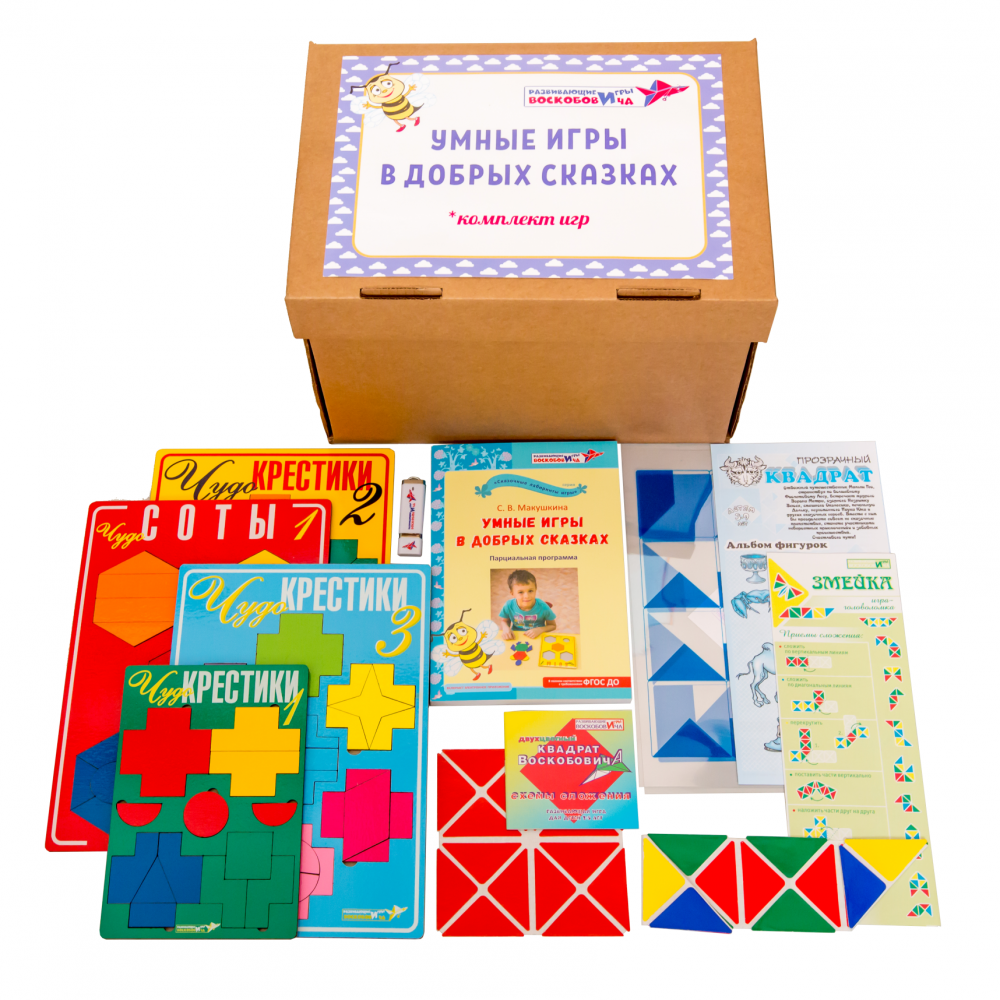 Комплект содержит набор пособий для группы из 10 человек для реализации парциальной программы «Умные игры в добрых сказках» (5-7 лет) С.В. Макушкиной (книга + USB-флеш с электронным приложением к программе + 10 наборов игр для детей) в коробке (картон).