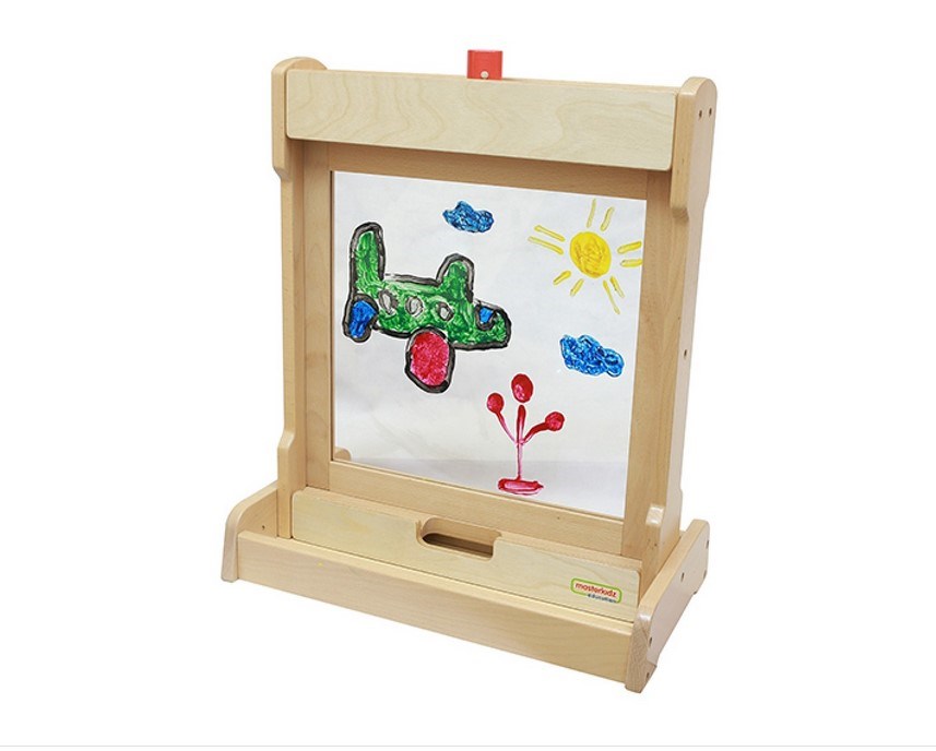 2) Для размещения настенных панелей Masterkidz серии ME размерами 46 х 46 см (например ME13774, ME03713, ME07285 и др.). Воспитатели могут легко менять панели в соответствии с учебной тематикой и займет это менее минуты. В верхней части мольберта имеется вращающийся фиксатор для закрепления панели.