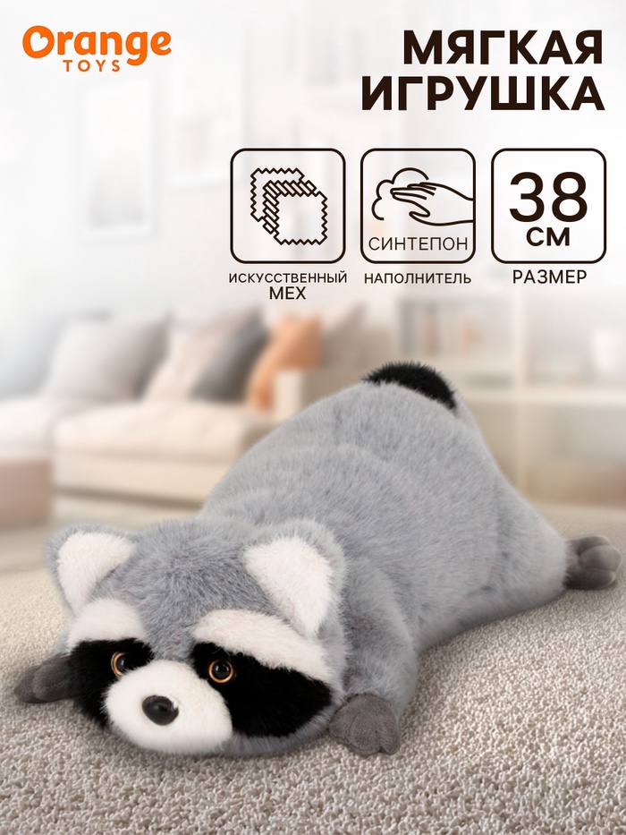 - Игрушка выполнена в виде игривого енота с мягкой и приятной текстурой.