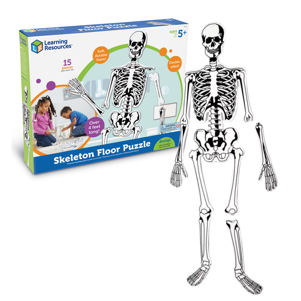 С помощью набора дети будут изучать человеческое тело, собирая головоломку в натуральную величину. В процессе игры вы можете предложить детям лечь поверх завершенной головоломки и сравнить скелет с их собственными телами.