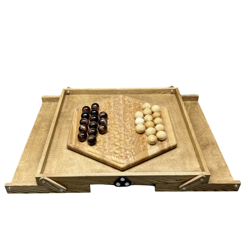 Комплектация- игровое поле древесина ясеня с крышками - 14 светлых шариков - 14 темных шариков