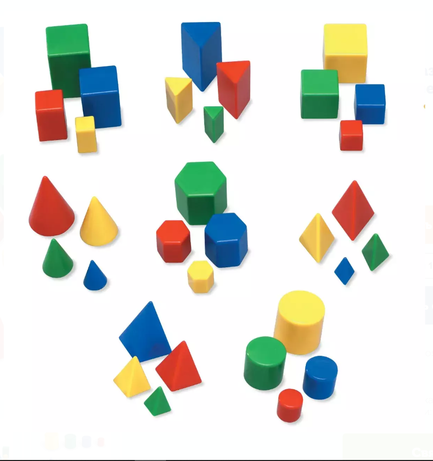 - 32 трехмерные фигуры в 4 размерах (треугольная призма, куб, конус, цилиндр, прямоугольная призма, шестиугольная призма, треугольная пирамида и квадратная пирамида)