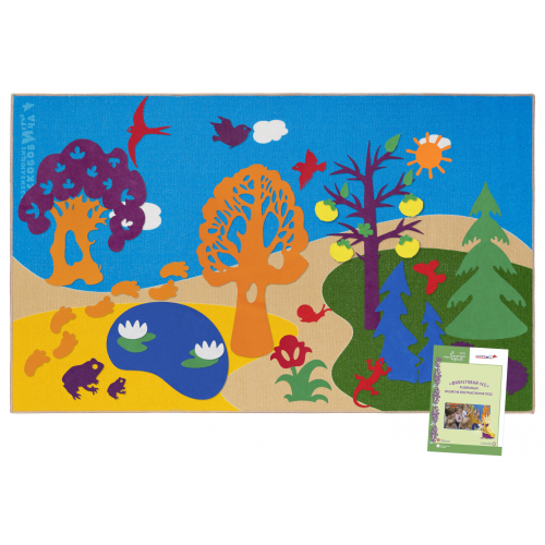 2. Переносные модульные элементы из ковролина для крепления к основе: дерево (4 шт.), ёлка (3 шт.), озеро (1 шт.), солнышко (1 шт.), цветок, кувшинка (2 шт.), цветок (1 шт.), золотой плод (5 шт.), лист фигурный (10 шт.), лист ажурный (10 шт.), лист 3-х размеров, 4-х цветов (72 шт.), лист кувшинки (2 шт.), бабочка (2 шт.), божья коровка (1 шт.), стрекоза (1 шт.), птица (3 шт.), ласточка (1 шт.), ёжик (2 шт.), мышка (2 шт.), лягушка (1 шт.), змейка (1 шт.), ящерица (1 шт.), улитка (1 шт.), следы (5 пар).
